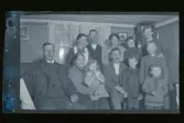 "Vid Tegelbruket Far 70 år." Grupporträtt. Kvinnor, män och barn poserar framför ett hus. Längst fram sitter fotografens föräldrar Fredrik Vilhelm Eriksson (f.1854) och Anna Maria Larsdotter (f.1856) vid ett bord med blommor.