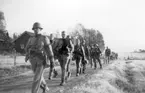 Hemmarsch från övning. Plats Trädgårdsgatan framför hotell Billingen (till vänster i bild) och hotell Billingens trädgårdsservering (till höger i bild).