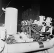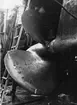 Propellerflygplan syns flyga över himlen intill ett fartyg som fotografen tar bilden på. Fartygets skorstenar skymtar till höger i bild. En del av havet syns och spåren i vattnet indikerar att fartyget är i rörelse.