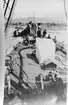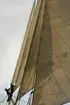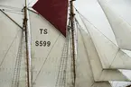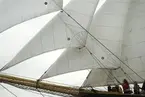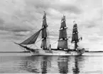 Segelbåt till sjöss. I bakgrunden syns land en enstaka moln.