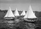 Elever och befäl vid Svenska Seglarskolan. I bakgrunden FALKEN.
