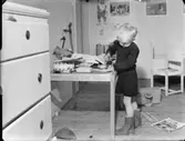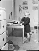 "Husmor med barn i hemmiljö" Pojke med stövlar på fötterna hamrar på ett bord med leksaker Interiör