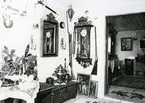 Ungdomar har kalas och står med dryckesglas i salongen. Vid vägguret står ett hembiträde. (Se även bildnr HB472)