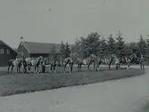 "Hästpremiering." Sex uppställda hästar, hållna av var sin man på okänd ort och gård. Ekonomibyggnaden i bakgrunden har en vällingklocka på gavelnocken.