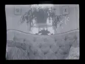 Salongsinteriör med rokokomöbler i förgrunden, kristallkrona, breda taklister och stora gröna växter. Golvet täcks av stora mattor och fotot är taget mot två rumshöga fönster.
