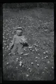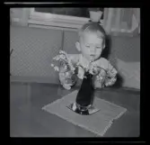 Torghandel i Varberg omkring 1955. Emma Johansson från Träslöv och Nisse Gustavsson. Emma har växter i lerkrukor på bordet och Nisse håller på att så in något i papper.