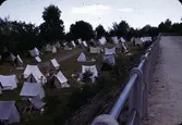 Rosa Pettersson lagar mat på ett bensinkök under en tältsemester någonstans i Blekinge, 1950-tal. Familjen hade skaffat en begagnad bil (Opel Olympia av 1949 års modell) och under somrarna rese de till olika landskap i Sverige.