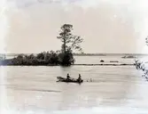 Man med två hundar i en flatbottnad eka på ån Nossan.