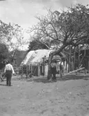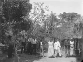 Fotografi från expedition till Peru 1920. Motiv av familj framför hydda i djungeln.