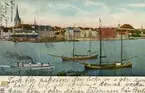 Enligt Bengt Lundins noteringar: "Ljungskile före sekelskiftet". Kommentar: "Gåramålning av C.G pettersson 1892". Text på kortets baksida: " Gåramålning över Ljungskile av C.G. Pettersson 1892. De stora gårdarna är från vänster Simmeröd, Övre Tjöstelsesröd, nedre Tjöstelseröd och Hälle. Vid vattnet Cederström (nu Resteröds Trikå), Gästgivaregård (nu Ekipering), Ulriksdal (nu Nordströms), Varmbadhuset och Havremagasinet".