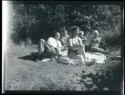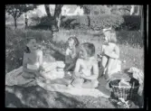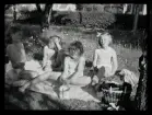 Stockholms skärgård. Midsommarfirande. Barnen binder kransar till majstång