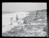 Vykort, "Kärradal. Badstranden". Strandvy över vattnet, med några badande, mot sanddynerna, några små byggnader och berget i bakgrunden.