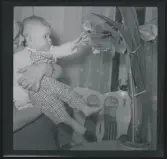 Torghandel i Varberg omkring 1955. Emma Johansson från Träslöv och Nisse Gustavsson. Emma har växter i lerkrukor på bordet och Nisse håller på att så in något i papper.