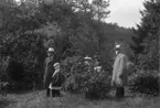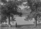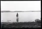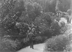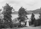 En pojke sitter på ett verandaräcke, bredvid honom står en kvinna med armen om pojken, Villa Klippan, Gustavsberg