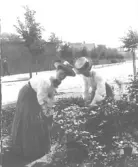 Fru Anna Johansson i trädgården till "Trebeningens" hus. (Uppgifter från album K 26) Stugan flyttades från Drejaren 1 ca. 11 m söderut när järnvägen drogs fram 1886.
