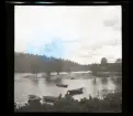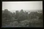 En kvinna och två män på en klippa vid havet, i bakgrunden slår en våg upp. "'Tripp, Trapp, Trull' försjunkna i beundran af hafsscenerier vid Landsort den 24 aug. 1905".