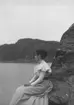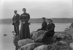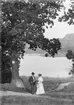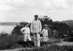 Tre personer står på en veranda, bakom dem är ett skynke upphängt som bakgrund. Personerna på bilden är Karl och Elisabeth Möller samt en av deras söner. Familjen Möller tillbringade många somrar på Gustafsberg och Elisabeth var även där som barn.
