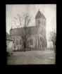 Människor framför Rättviks kyrka, vissa klädda i folkdräkt.