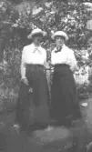 Två unga kvinnor i promenaddräkt har slagit sig ner vid ett stenröse intill en tall.