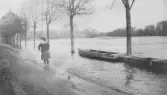 En kvinna i promenaddräkt och hatt vid en sjö.