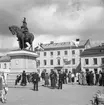 En grupp kvinnor och män samlade kring dubbelstatyn från 1915 på Kungstorget i Uddevalla