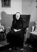 EN ÄLDRE DAM SITTANDE I EN KORGSTOL