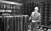 Julreportage, United Shoe 3 februari 1966 En man klädd i kostym står i förgrunden inne i en fabrikslokal. Det är United Shoe. I bakgrunden syns fabriksarbetare jobba. Man tillverkar skotillverkningsmaskiner.