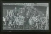 "Bärsta, Karl-Erik Larsson 70 år." Grupporträtt. Kvinnor, män och barn poserar på framför ett hus. Bakom dem vid ytterdörren står en lövad båge med siffrorna '10 År' högst upp.
