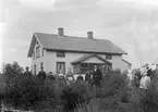Ett bostadshus med en anlagd trädgård med flaggstång.