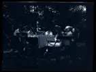 Kafferep. Ett sällskap sitter samlade i trädgårdsmöblerna vid villa Solveden, Djurholm.