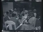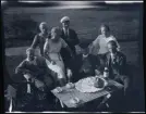 Ett sällskap ungdomar sitter och fikar utanför familjen Morthensens villa Solveden, Djursholm. Till vänster Sven Morthensen.