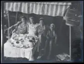 Ett sällskap vuxna och barn fikar utomhus.