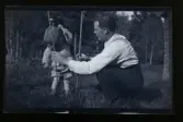 "Stockholm. Oden." En man hukar i gräset intill ett litet barn som provar en hatt på huvudet.