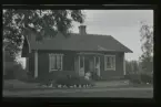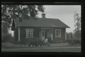 "Fogelstad tegelbruk." Familjen Axel, Frida, Anna-Lisa Fredriksson och brodern Ivar Fredriksson poserar på farstubron till sitt hus.