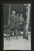 "Ebba Larsson, Abba Andersson, Astrid Andersson, Fogelstad." Tre kvinnor poserar ståendes på ett staket. Deras skidor står lutade mot staketet och de har stavar i händerna.