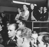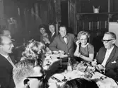 NBärmast t h sitter Birgit Sander, bredvid Bertil Lindskog. På vänster sida fr v: ?, Bengt Colliander, Karin Gustafsson, Helge Jäder och Gösta B Larsson.