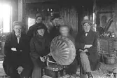 FAMILJ SAMLAD RUNT KAFFEBORDET. EN TRATTGRAMMOFON STÅR I BAKGRUNDEN.