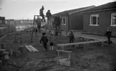 Snögrottor, 4 december 1965. Man varnar för 'farliga snögrottor' i snöhögarna från snöplogarna. Här bygger barnen en snöfästning på stora cementrör på en fyrkantig innergård omgiven av hyreshus. I bakgrunden snötäckta gungor.