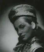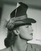"Agnes". Modell i hatt, hög kulle, skärm fram. Sjal draperad om kullenl, resår runt nacken.