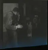 Julfirande, fru Johnsson med gossar jultomten, två kvinnor och en man, Johnssons privata bilder Metallutfällning.