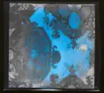 1950. Frankrike. Personer inne i ett café sedda utifrån, genom spetsgardin som hänger i skyltfönstret.