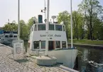 Bygget av Södertälje kanalverk. Ett antal fartyg vid en omlastningskah invid en av Lantmännens sädesmagasin. I förgrunden ligger en motorbåt.