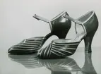 Skomode visas på Nordiska Kompaniet 1941. Ett par ljusa damskor med halvhög klack, perforerat hålmönster och knytning.