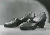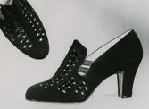 "Mellanskor. Hög pumpsmodell av svart mocca med inflätningar av svart lack". Skor med hög klack och genombruten dekor.