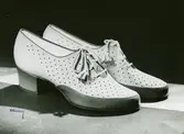 "Sommarskor. Promenadskor. Sommarskor av vit nubuck med garnering av café au lait färgad sidenkalv. Italiensk klack". Perforerat mönster, snörning.
