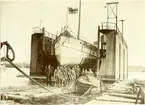 "U-dockan". byggd vid Södra varvet för Vaxholmsbolagets räkning. [1911] Kopnstruerad av ing. [Anders Fredrik] Viking. L på bryggan 30m, l på pontonen 25m, utvändig bredd 14m, största bredd mellan fendrarna 27 fot.