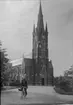 "Kyrkan i Norrköping. 1/25 s. f. 8. 4/9 1916, 15:40. Sol.Imperial." Man på cykel framför kyrka.