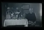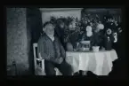 "Edvin Eriksson, Rensbol." Porträtt av en man som sitter vid ett bord med gratulations-blommor.