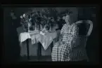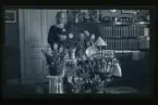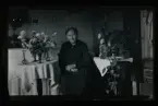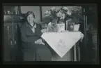 "Valfiskstugan Augusta o Karl Lindkvist, Gerda." Porträtt av en kvinna som står vid ett bord fullt av gratulations-blommor.