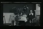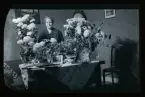 "Målsjö." Porträtt av en kvinna och man som sitter vid ett bord fullt av gratulations-blommor.